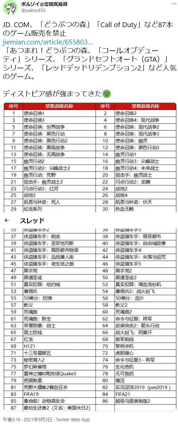 17 風吹けば名無し :2021/09/03(金) 16:02:12.24 ID:qXolDSA60.net日本ファルコム「中国に発禁されると倒産します」