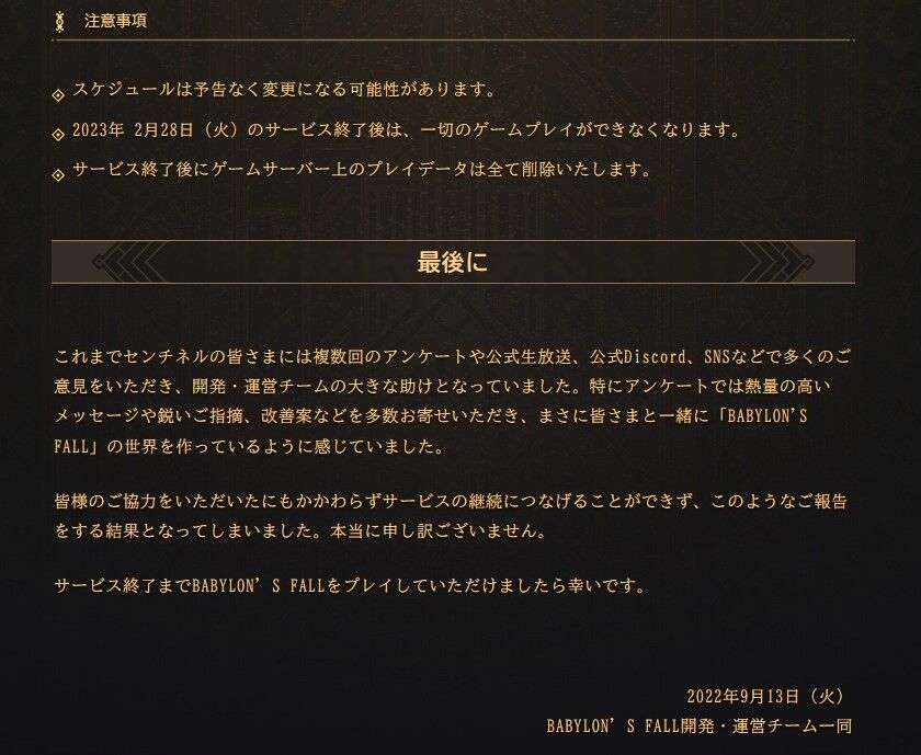 このたび、「BABYLON’S FALL」は2023年2月28日(火)16:00をもちまして、サービスを終了させていただくこととなりました。