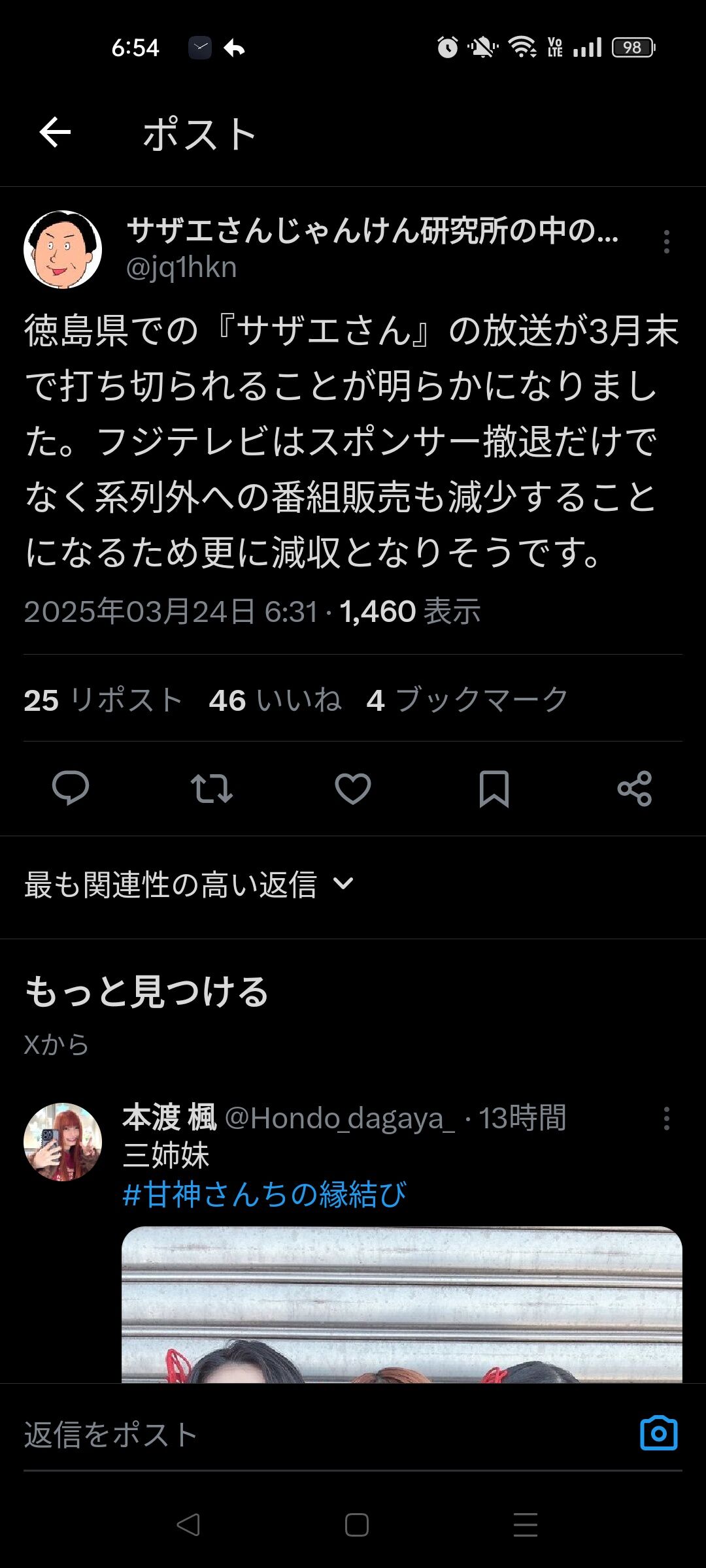 ああ四国放送のサザエさんが打ち切られるんか。というか四国放送でサザエさんやってたんだな知らんかったわ